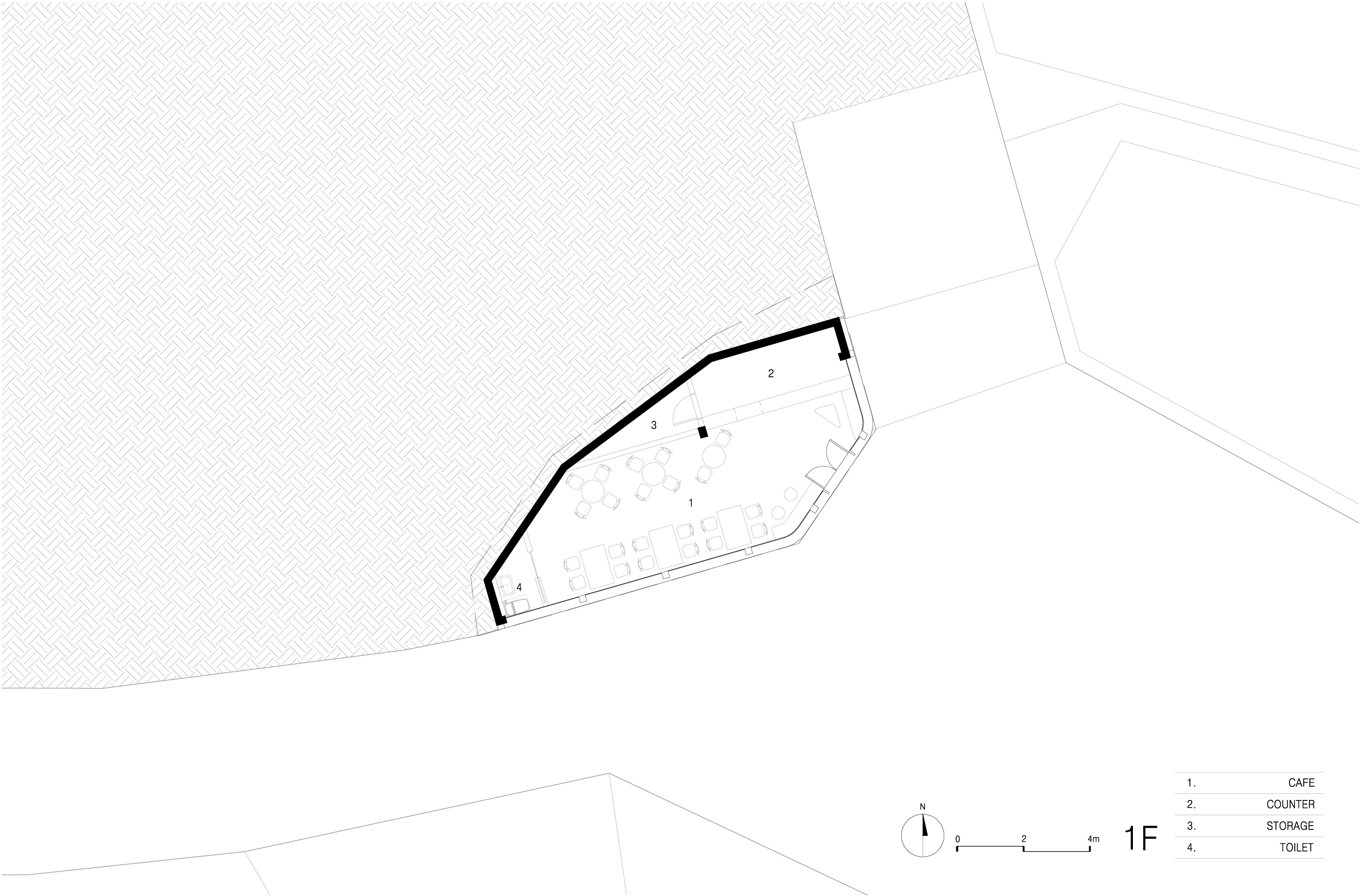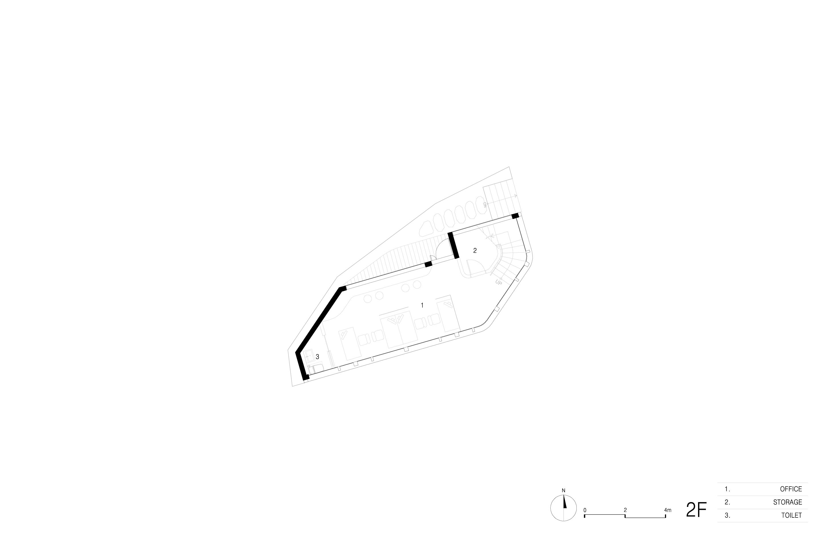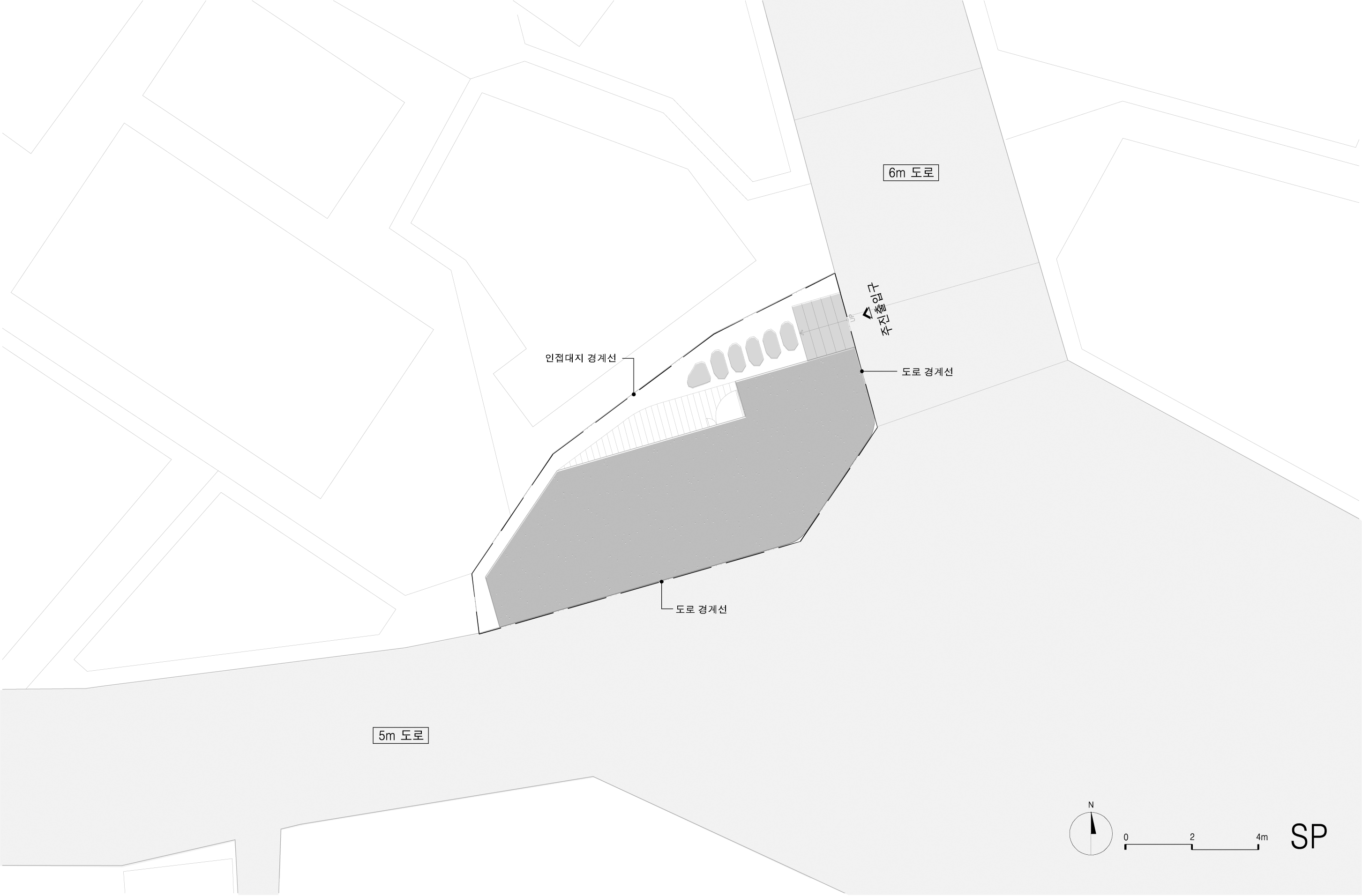 이 오피스는 경사 지반에 주변 주택 밀집 속에서 대지가 도로의 코너에 작은 면적으로 위치해 있다. 더불어 1층에는 카페 그리고 2~4층에는 사무실이 위치하게 되어 도시 경관상 입면 디자인이 중요하게 되어졌다.