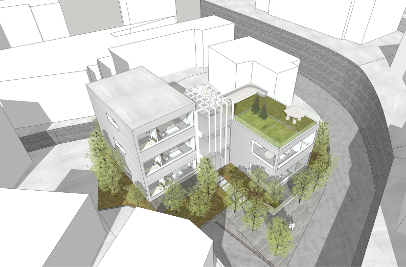Accordingly, the use of inclined and deformed land was made to face the external space on each side of the building, thereby increasing the utilization of residents on the first floor, and natural phenomena caused by planting can be seen on the second floor or higher.