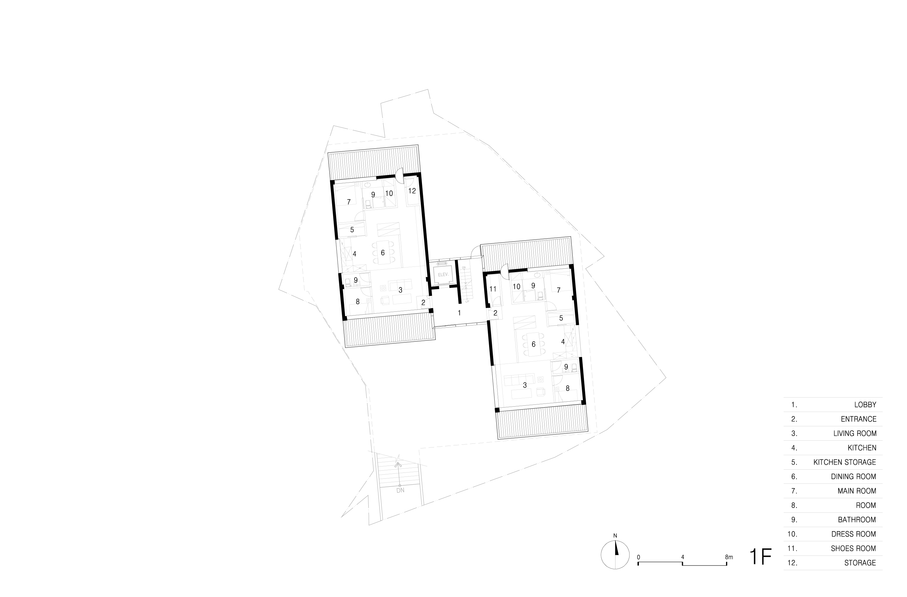 In this row house, the land status is formed due to be close by the land in the concentration of surrounding houses on the inclined ground. In addition, as it belonged to the natural landscape district according to the district unit plan, it was forced to apply a more limited building-to-land ratio, and the use of external space became important.