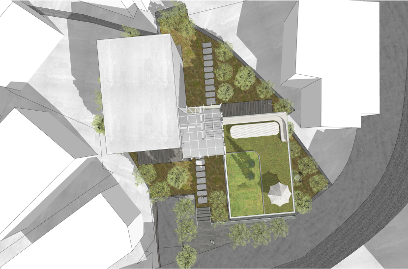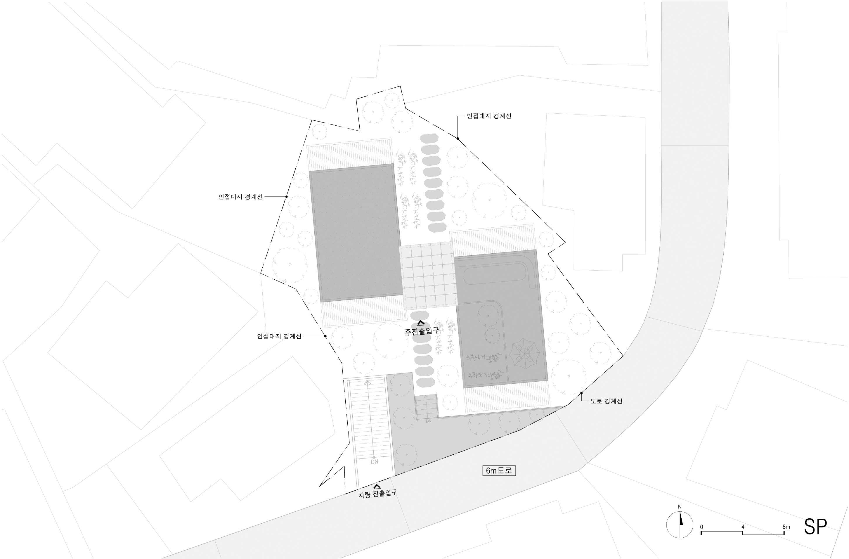 이 연립주택은 경사 지반에 주변 주택 밀집 속에서 대지의 형태가 이형으로 대지 현황이 형성되어 있다. 더불어 지구단위계획 상 자연경관지구에 속하게 되어서 보다 제한적인 건폐율을 적용 할 수 밖에 없게 되어 외부공간의 활용이 중요하게 되어졌다.